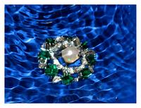 The emerald green and royal blue color scheme contrast in the photograph and create a stark clarity between the diamond and the water.